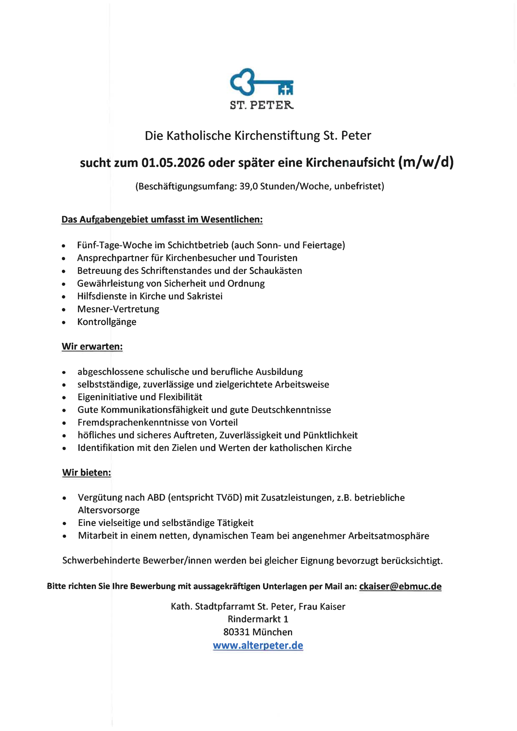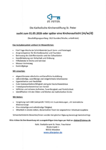 Die Pfarrkirchenstiftung St. Peter sucht Interessierte für folgende Stellen: